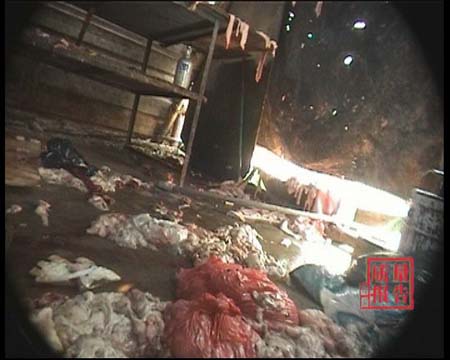 天津兴达食品厂其实就是一家小作坊。外边的一间小屋,算是绞肉车间,里面灯光昏暗、墙上落满了灰尘。一台绞肉机和几口大缸是这里的主要设备。(空镜)这位戴眼睛的年轻人自称是厂里的技术员。他说,他们使用的猪肉都是杀猪时丢弃的下脚料。记者:这是什么肉