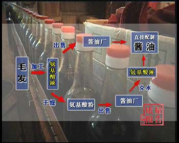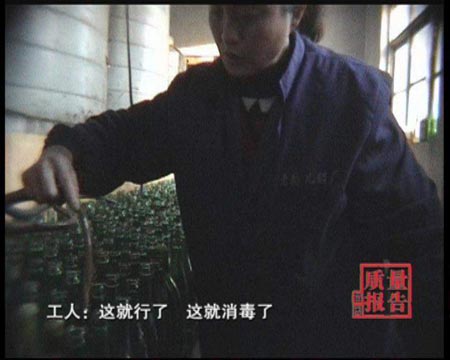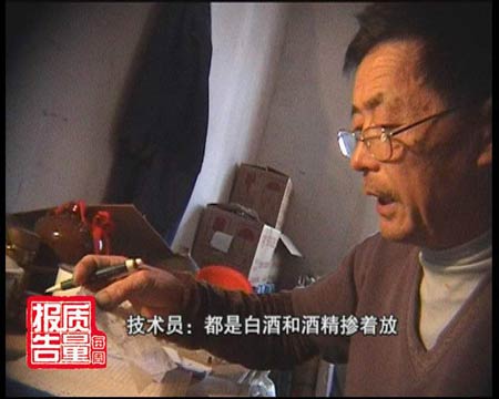 技术员:陈醋的颜色应该是深色的,这个原醋颜色太淡。记者:加了色素颜色就深了,像陈醋似的