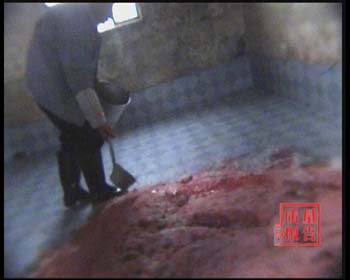 几个小时后,这些接受“洗胃”的活牛,肚子被灌得滚圆滚圆的,四脚朝天,直翻白眼,发出痛苦的哀鸣。(空镜)面对已经是奄奄一息的活牛,屠户们仍不肯罢手。他们接着将一根十多厘米长,小拇指粗的锋利的钢管插入牛的胃里。
