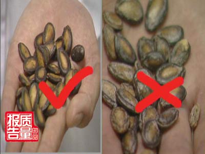 瓜子生产工艺专家来明乔:消费者在购买瓜子的时候,如何鉴别优质的瓜子与加了滑石粉的、石蜡的瓜子呢?就拿西瓜籽来说,我们首先看它的外观,优质的西瓜子中间颜色是黄色的,四周是黑色的,两个颜色界限非常分明,劣质的产品它往往表面颜色模糊不清,同时一些加了滑石粉、石蜡的瓜子呢,他表面还有白色的结晶(物),因此它会有比较滑的感觉。下面我们来做一个实验,这里是两堆瓜子,当我们慢慢地抬起这个平板的时候,当这个平板达到45度左右的时候,有滑石粉的一堆瓜子就(滑)下去了,而好的瓜子它还是不动的