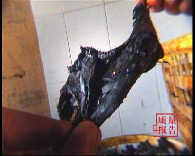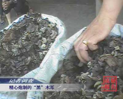 记者在调查中发现,不法商贩制售木耳的厂房条件简陋,卫生状况也极其恶劣。不法商贩为了使他们用低价收来的木耳更像东北优质木耳可谓“煞费苦心”,他们不但用剪刀将这些大木耳修剪成东北木耳的形状。而且用劣质墨汁着色,使其看起来乌黑发亮。另外,为了增加木耳的重量,不法商贩还在木耳中加入了一种叫料子的东西。山东枣庄的杏花村干货市场上又发现了价格极为低廉的黑木耳,一般情况下,一斤黑木耳是三四十块钱,而在这个市场上却只卖四五块钱一斤,我们先来“见识”一下这是一种什么样的黑木耳。
