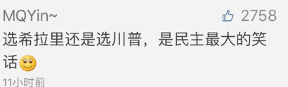 而在中国,前两天朋友圈被所谓“希拉里也被闺蜜控制了”的言论刷了屏,底下的评论都在说希拉里是个大骗子,同情美国人可怜到只能从Trump这头猪和希拉里这个骗子中间选一个,说这是民主最大的笑话。